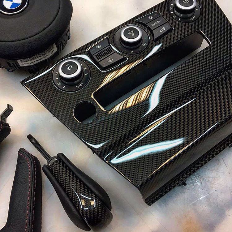 Ламинация настоящим карбоном деталей интерьера автомобиля.